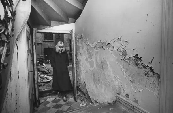 I oppgangene vokser sopp i klaser, puss og maling skaller av. I bakgården flyter søppel, og vinduer er slått ut. Olaf Ryes plass 6, November 1981. Osvold-gård.