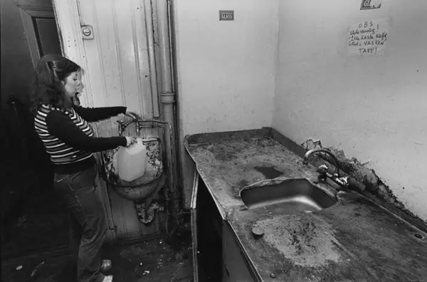 Kvinne på forfallent kjøkken. Fotografiet er fra prosjektet og boka ''Oslo-bilder. En fotografisk dokumentasjon av bo og leveforhold i 1981 - 82''. Kontakt Samfoto ved ev. bestilling av kopier.