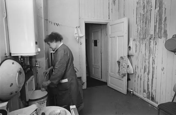 Eldre dame på kjøkkenet. Bildet er publisert på side 103 i boken Oslo-bilder Fotografiet er fra prosjektet og boka ''Oslo-bilder. En fotografisk dokumentasjon av bo og leveforhold i 1981 - 82''. Kontakt Samfoto ved ev. bestilling av kopier.