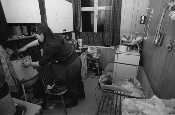 Kvinne på kjøkkenet med spedbarn i en lekegrind. Fotografiet er fra prosjektet og boka ''Oslo-bilder. En fotografisk dokumentasjon av bo og leveforhold i 1981 - 82''. Kontakt Samfoto ved ev. bestilling av kopier.