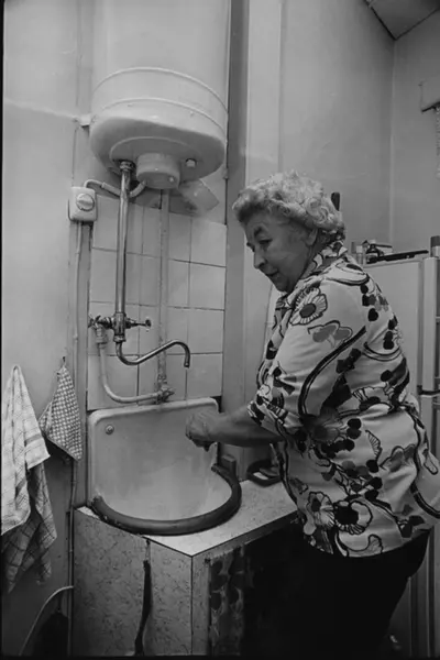 Eldre dame ved utslagsvasken på kjøkkenet. Fotografiet er fra prosjektet og boka ''Oslo-bilder. En fotografisk dokumentasjon av bo og leveforhold i 1981 - 82''. Kontakt Samfoto ved ev. bestilling av kopier.