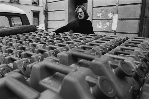 Parafinleveranse Scleppegrells gate. Januar 1982? Parafinkanner på lastebil. Fotografiet er fra prosjektet og boka ''Oslo-bilder. En fotografisk dokumentasjon av bo og leveforhold i 1981 - 82''. Kontakt Samfoto ved ev. bestilling av kopier.