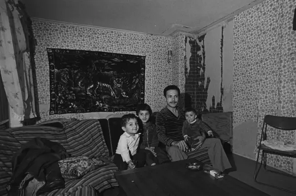 Innvandrer med tre barn i stua. Leiligheten var uten bad og do og med en kaldtvannskran som eneste vannkilde. Bildet er publisert på s. 60 i boken Oslo-bilder. Innvandrernes boforhold. Fotografiet er fra prosjektet og boka ''Oslo-bilder. En fotografisk dokumentasjon av bo og leveforhold i 1981 - 82''. Kontakt Samfoto ved ev. bestilling av kopier.