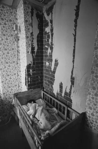 Ett barn til sengs. Innvandrernes boforhold. Bildet er publisert på s. 61 i boken Oslo-bilder. Innvandrernes boforhold. Fotografiet er fra prosjektet og boka ''Oslo-bilder. En fotografisk dokumentasjon av bo og leveforhold i 1981 - 82''. Kontakt Samfoto ved ev. bestilling av kopier.