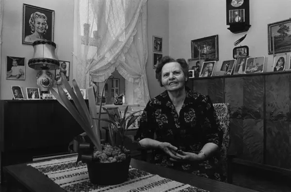 Bildetekst fra boken Oslo-bilder s. 26:" - Jeg står på venteliste for aldersbolig. Jeg håper det blir plass til møblene mine når jeg en gang får leilighet...Inne har hun med egne midler skapt en trivelig leilighet - mens gården ellers er falleferdig." Eldre kvinne i stua si med familieportretter. Fotografiet er fra prosjektet og boka ''Oslo-bilder. En fotografisk dokumentasjon av bo og leveforhold i 1981 - 82''. Kontakt Samfoto ved ev. bestilling av kopier.