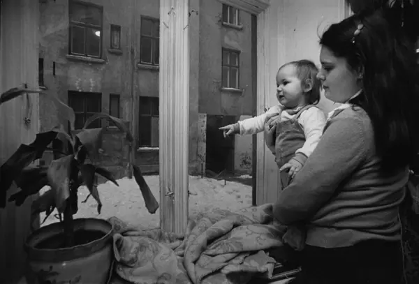 Mor med et barn på armen ved vinduet. Bildet er publisert på s. 64 - 65 i boken Oslo-bilder. Fotografiet er fra prosjektet og boka ''Oslo-bilder. En fotografisk dokumentasjon av bo og leveforhold i 1981 - 82''. Kontakt Samfoto ved ev. bestilling av kopier.