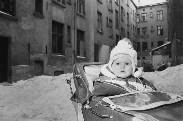 Barn i barnevogn i forfallen bakgård vinterstid. Fotografiet er fra prosjektet og boka ''Oslo-bilder. En fotografisk dokumentasjon av bo og leveforhold i 1981 - 82''. Kontakt Samfoto ved ev. bestilling av kopier.