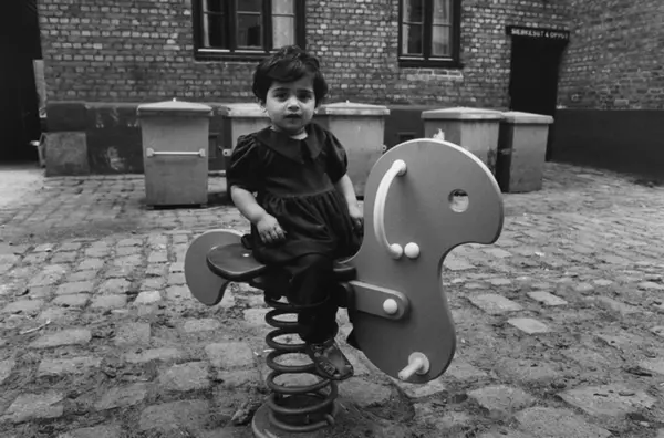 Med bakgården som lekeplass. Lita jente på lekeapparat. Bildet er publisert på s. 17 i boken Oslo-bilder. Innvandrernes boforhold. Fotografiet er fra prosjektet og boka ''Oslo-bilder. En fotografisk dokumentasjon av bo og leveforhold i 1981 - 82''. Kontakt Samfoto ved ev. bestilling av kopier.