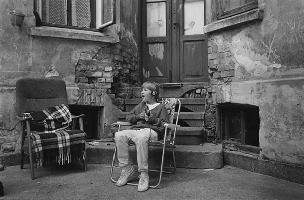 Med bakgården som lekeplass. Innestol med pledd. Jente på campingstol hører på musikk. Fotografiet er fra prosjektet og boka ''Oslo-bilder. En fotografisk dokumentasjon av bo og leveforhold i 1981 - 82''. Kontakt Samfoto ved ev. bestilling av kopier.