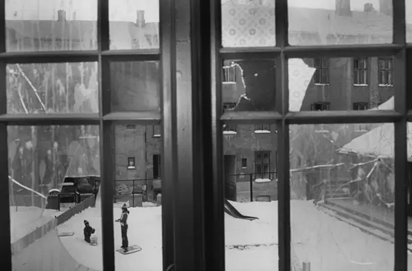 Barn i snøen sett gjennom knust trapperomsvindu. Med bakgården som lekeplass. Innvandrernes boforhold. Fotografiet er fra prosjektet og boka ''Oslo-bilder. En fotografisk dokumentasjon av bo og leveforhold i 1981 - 82''. Kontakt Samfoto ved ev. bestilling av kopier.