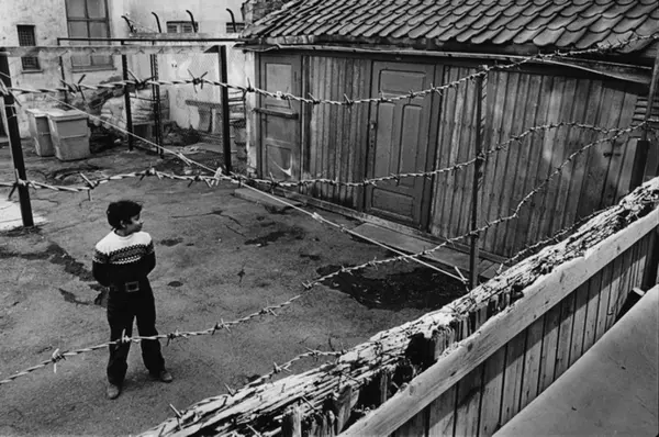 Gutt bak piggtråd. Med bakgården som lekeplass. Innvandrernes boforhold. Fotografiet er fra prosjektet og boka ''Oslo-bilder. En fotografisk dokumentasjon av bo og leveforhold i 1981 - 82''. Kontakt Samfoto ved ev. bestilling av kopier.
