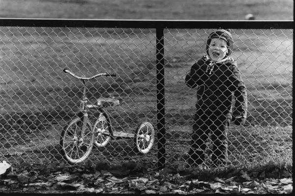 Gutt med trehjulssykkel bak gjerde. Fotografiet er fra prosjektet og boka ''Oslo-bilder. En fotografisk dokumentasjon av bo og leveforhold i 1981 - 82''. Kontakt Samfoto ved ev. bestilling av kopier.