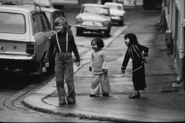 Barn på fortauet. Innvandrerjenter. Fotografiet er fra prosjektet og boka ''Oslo-bilder. En fotografisk dokumentasjon av bo og leveforhold i 1981 - 82''. Kontakt Samfoto ved ev. bestilling av kopier.