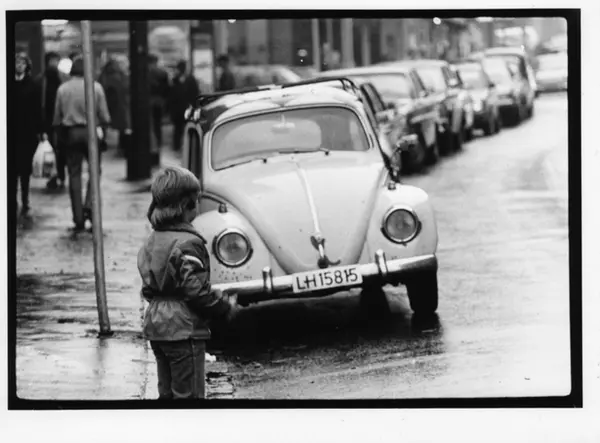 Barn på fortauet. Trafikkmiljø. Volkswagen boble. Fotografiet er fra prosjektet og boka ''Oslo-bilder. En fotografisk dokumentasjon av bo og leveforhold i 1981 - 82''. Kontakt Samfoto ved ev. bestilling av kopier.