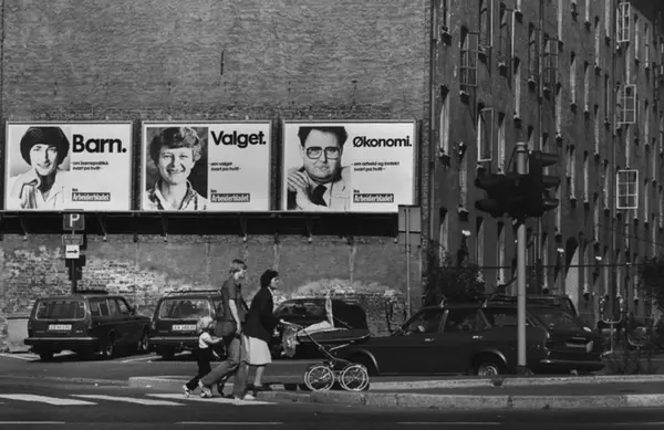 Mor med barnevogn i trafikkmiljø. Reklameplakater for Arbeiderbladet på husvegg. Fotografiet er fra prosjektet og boka ''Oslo-bilder. En fotografisk dokumentasjon av bo og leveforhold i 1981 - 82''. Kontakt Samfoto ved ev. bestilling av kopier.