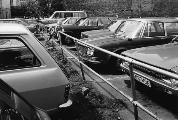 Gutt som leker på en parkeringsplass. Bil. Lekemiljø. Trafikkmiljø. Fotografiet er fra prosjektet og boka ''Oslo-bilder. En fotografisk dokumentasjon av bo og leveforhold i 1981 - 82''. Kontakt Samfoto ved ev. bestilling av kopier.