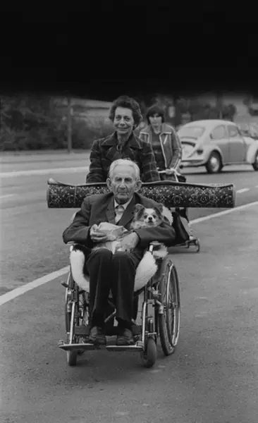 Trafikkmiljø. Dame triller en eldre mann i rullestol på fortauet. Fotografiet er fra prosjektet og boka ''Oslo-bilder. En fotografisk dokumentasjon av bo og leveforhold i 1981 - 82''. Kontakt Samfoto ved ev. bestilling av kopier.