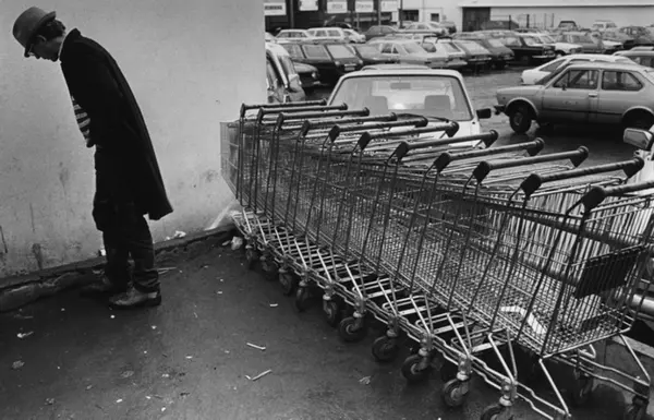 Mann på parkeringsplass ved kjøpesenter. Handlevogner. Fotografiet er fra prosjektet og boka ''Oslo-bilder. En fotografisk dokumentasjon av bo og leveforhold i 1981 - 82''. Kontakt Samfoto ved ev. bestilling av kopier.