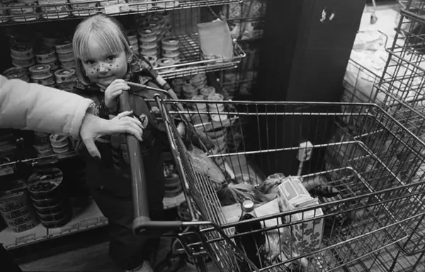 Barn og handlevogn. Fotografiet er fra prosjektet og boka ''Oslo-bilder. En fotografisk dokumentasjon av bo og leveforhold i 1981 - 82''. Kontakt Samfoto ved ev. bestilling av kopier.
