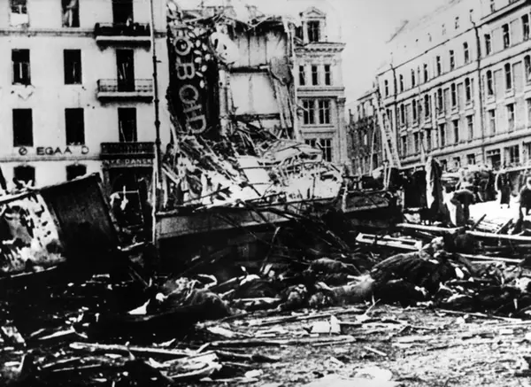 Bombet bygård 31.desember 1944, vrak av sporvogn, brannbil. Bakgrunnen for ødeleggelsen av denne bygården var engelskmennenes forsøk på å bombe tyskokkuperte Victoria Terrasse. Feilbombingen skal ha ført til at mange sivile liv gikk tapt, 55 omkom på trikken som passerte på Drammensveien.