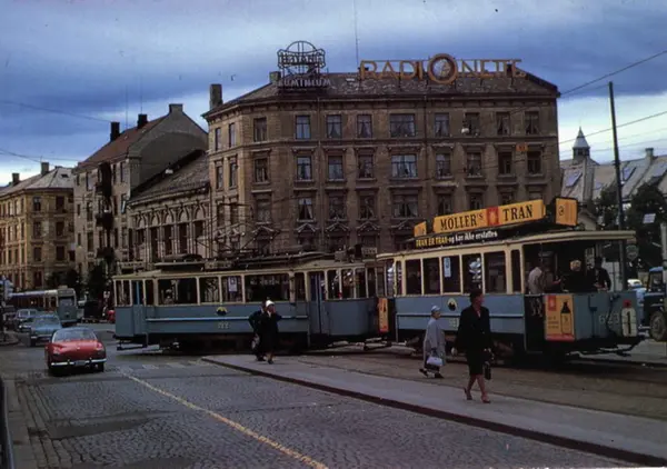 Trafikkmiljø ved krysset Kirkeveien Sørkedalsveien. Kirkeveien 62 i bakgrunnen. Reklame for Høyang aluminium og Radionette på taket. Reklame for Møllers tran på tilhengervogn. Motorvogn 122 er bygget i 1921-23 av KSS/SSW. Tilhenger 623 er bygget i 1921 av HAWA. Postkort.