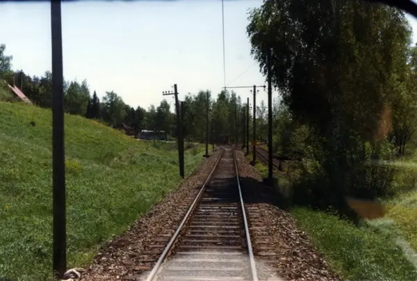 Ekebergbanen. Trikkelinjen inn mot trikkesløyfen på Ljabru. Bildet er tatt mellom 1974 og 1977, pga. gullfisk-trikkene er kommet i drift (sept. 1974), mens det fortsatt er enkeltspor.