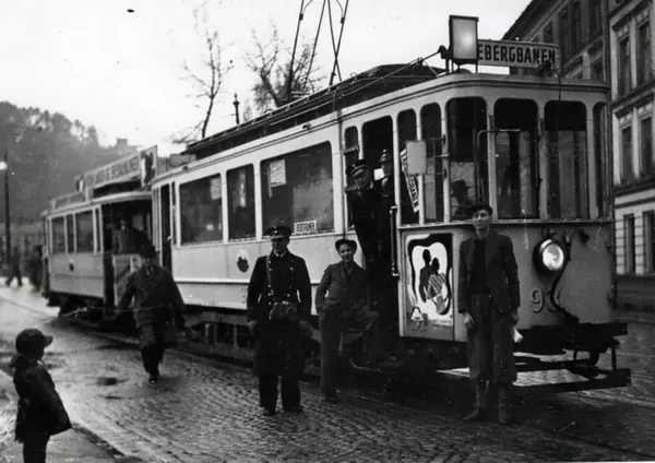 Trikk nummer 93 på Ekebergbanen (motorvogn, kallenavn SS-vogn) med tilhenger. Bygget 1914 av SSW og Skabo, vogntypen utrangert mellom 1966 og 1968. Konduktør, billettører og passasjerer poserer for fotografen. Fra Oslo gate.
