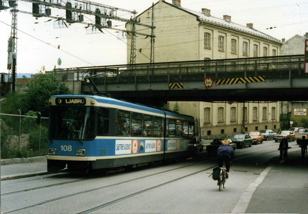 Oslo Sporveier. Blå leddtrikk 108 (type SL79 / I) på linje 9 mot Ljabru. Passerer under jernbanebroen i Oslo gate. (Oslo gate 1 nærmest i bakgrunnen. Trikken kom i drift på Ekebergbanen fra 1982.