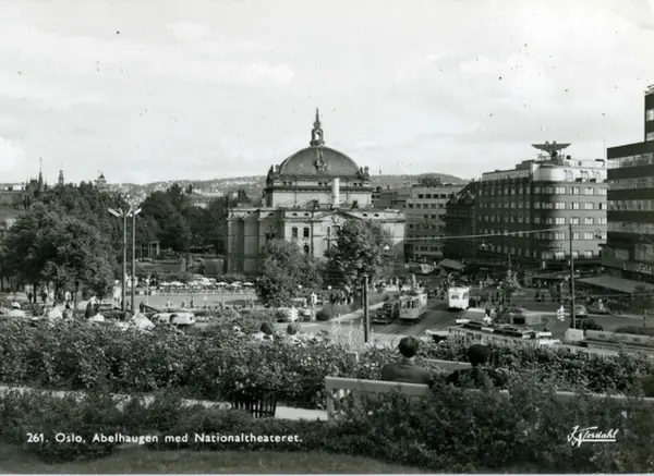 Oslo Sporveier. Drammensveien ned mot Stortingsgata sett fra Abelhaugen. Odd Fellow-bygningen, Hotel Continental, Nationaltheatret og Studenterlunden med Pernille uteservering. Biler og Gullfisktrikker. Sannsynlig fra 1950-tallet. Postkort 261.