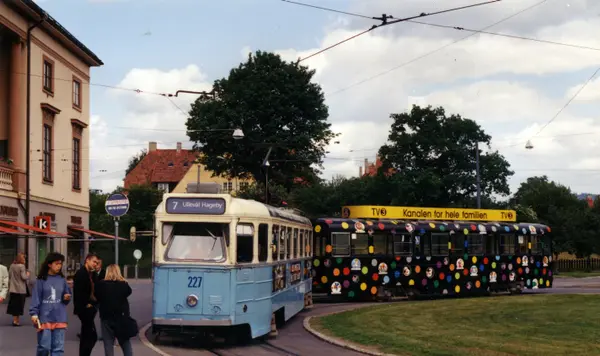 Ullevål Haqeby-trikken, Høka motorvogn 227. med sort og prikkfarget tilhenger, på linje 7 (Sinsen - Ullevål Hageby). Her ved endeholdeplassen på John Colletts plass. Trikkereklame for TV 3. Ullevål kino-bygget til venstre.