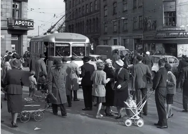Oslo Sporveier, Trolleybuss, linje 24 til Østbanen i gatekryss på Sagene. Sagene Manufaktur på hjørnet, den Røde Mølle ved siden av. På hjørnet av Arendalsgata og Grimstadgata.
