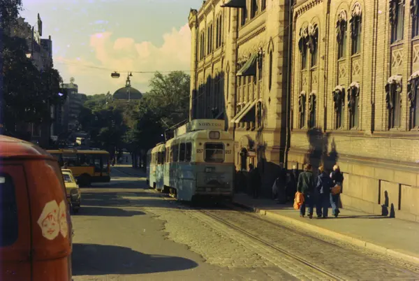 Oslo Sporveier. Høka tilhenger 657, kalt "stivkjelker" ut i fra gangegenskapene. Linje 1 i Stortingsgata ved Wessels plass. Til høyre Stortingsbygningen. I enden av gata Nationaltheateret.