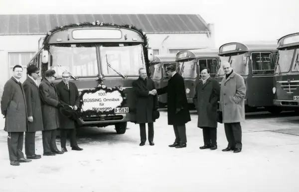 Oslo Sporveier. Nye enmannsbetjente busser fra Büssing på rekke og rad etter å ha blitt losset av fra båten. Fotografert ved Oslo havn. Representanter fra Büssing og Sporveiene stiller opp for fotografering.