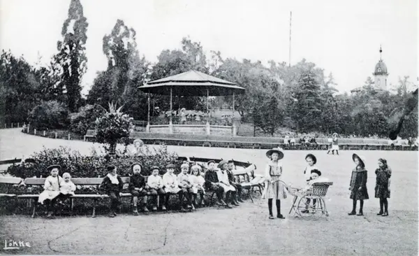 Barn i lek og hvile på Festplassen i parken. Barnevogn. Parkbenker, parktrær. Musikkpaviljong. Tårnet på oppsynsmannsboligen bakerst til høyre. Postkort uten nummer fra Atlantis Antikvariat.