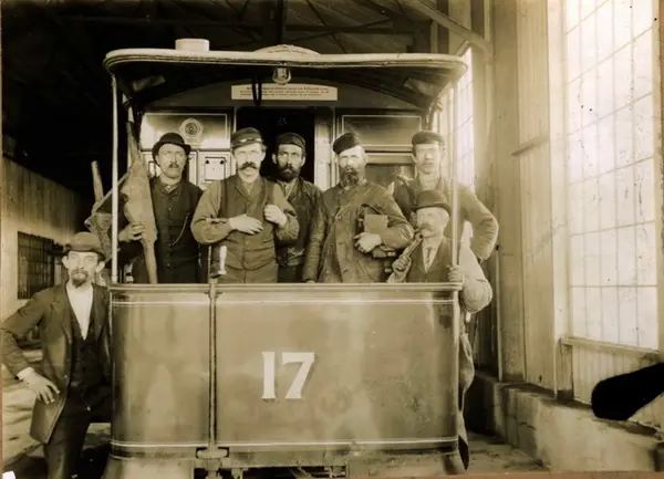 Følgende tekst er vedlagt bildet: "Kristiania elektriske Sporvei i 1896. Persola Kristiania elektriske Sporvei i 1896. foto- i vognhall I Majorstua. "Maskinverksted reparatörer." fra venstre: (Palm verksmester ca. 38 år) - (rep Chr. Falch. 26 år) - (ankervikler Abel Iversen 39 år) - (Hans Hansen elektr. 33 år) - (Ola Larsen, formann 37 år) - (Konrad Kristensen 31 år rep.) - (Adolf Lundhaug 33 år elektr.)P.S. ingen av disse lever nu.(Alderen er i 1896.) Snekkere og malere er ikke med her." Elektrisk sporvogn 17 tilhørende Blåtrikken. Verkstedsansatte poserer for fotografen i et av lagerskurene i Gardeveien på Majorstuen.