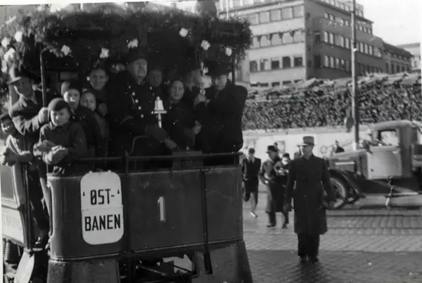 Kristiania Elektriske Sporveiselskaps / Blåtrikkens vogn nr 1 (tidligere hestesporvogn) ute på jubileumstur (mot Østbanen) i anledning 50-års markeringen av elektrisk sporvognsdrift. Blomsterdekorert tak og konduktør i tidsriktig uniform. Overfylt åpen perrong.