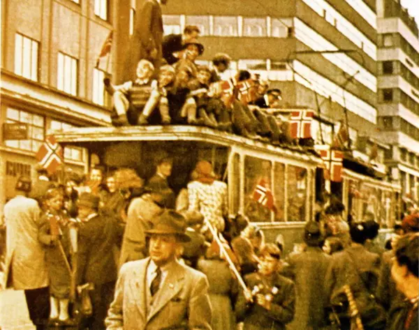 Oslo Sporveier. FRED! Fra feiringen i maidagene 1945, her i Stortingsgata utenfor Hotel Continental med norske flagg og stormende jubel. Trikk passerer med gratispassasjerer på tak og utendørsplattform.