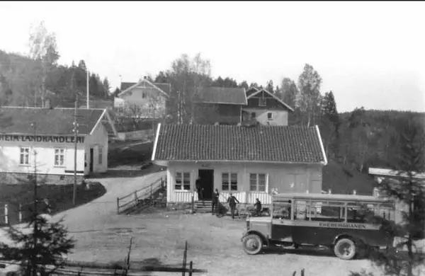 En av Ekebergbanens busser C-4054 (1.) ved Godheim landhandleri (til venstre) og "Se Op Hvilestue" i Enebakkveien. Endeholdeplass for ruta Sæter- Godheim.