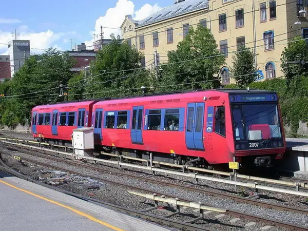 Oslo Sporveier. Majorstuen stasjon. Ny T-banevogntype T2000, vogn 2007 og 2008 på linje 1 til Frognerseteren. Politihøgskolen. Bildet tatt en gang mellom 1994-2000.