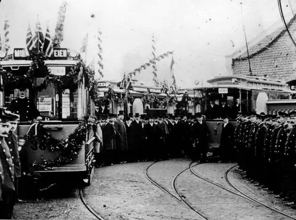 Pyntede Grønntrikker, motorvogn 3 og 38 type U (Union), innvielse av elektrisk drift på linja Munkedamsveien-Torshov. (Hestesporvognene ble derved en saga blott.) Sporvognsansatte og dignitærer. Fotografert utenfor Torshov vognhall 29. september 1899.