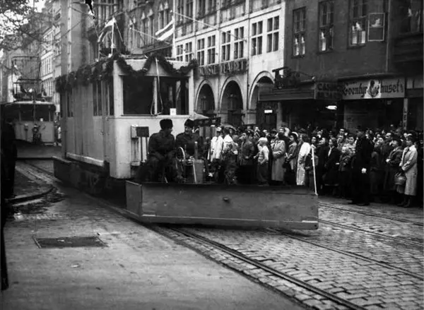 Utsmykket trikk 308 type U kalt "gråvogna" (slipevogn) med snøplog, jubileumskortesje 1950 (Sporveien 75 år) i Stortingsgata ved Det Norske Teatret. Fotografert 6. august 1950.