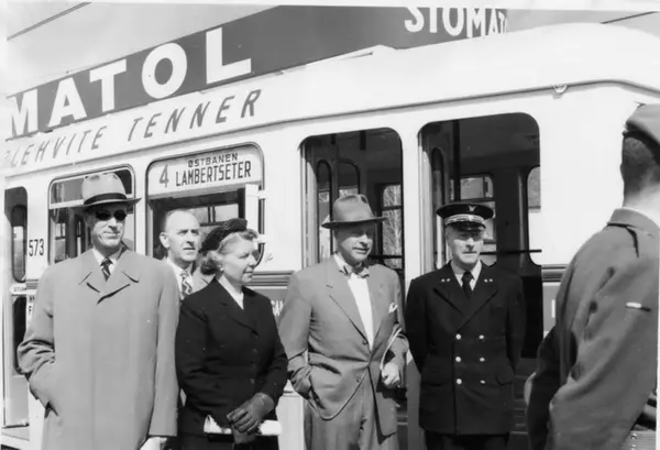 Oslo Sporveier. Nylevert trikk tilhenger 573 type TBO linje 4 fra Kjelsås over Østbanen, åpningsdagen på Lambertseterbanen 28. april 1957. Dignitærer, kontrollør i gammel uniform.