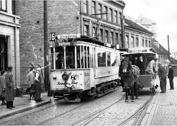 Oslo Sporveier. Trikk motorvogn type SS nr. 100 linje 16, Skøyen-Etterstad, møter hestesporvogn 6 under prøvekjøring før jubileet i 1950 (75 år siden første (heste-)sporvogn). St. Halvards gate ved Galgeberg.