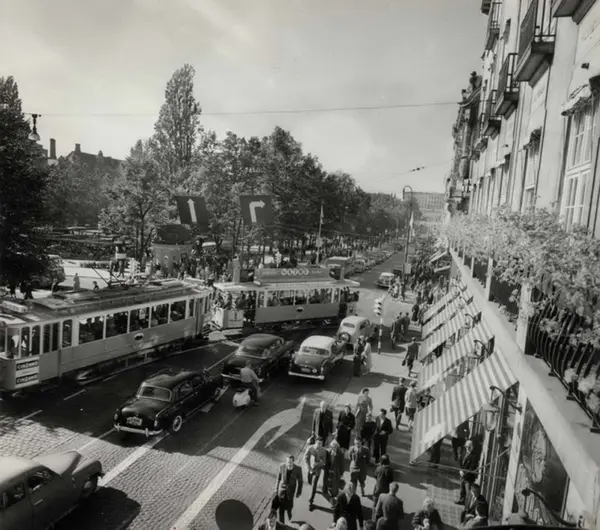 Oslo Sporveier. Trikk motorvogn 104 type SS og tilhenger 523 type kommunal ombygd på linje 11, Majorstuen-Kjelsås, her ved Grand Hotel i Karl Johans gate. Studenterlunden. Biltrafikk, spaserende.