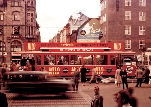 Oslo Sporveier. Trikk tilhenger 639 type SS bred fra 1914, linje 5, kombinasjonsrute Majorstuen-Sagene over Østbanen og St. Hanshaugen. Her foran utløpet av Karl Johans gate. Rushtidstrafikk. Helreklame for MILO vaskepulver, gavlreklame. Vognen utrangert på midten av 1960-tallet.