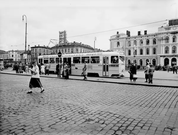Oslo Sporveier. Trikk motorvogn 225 type Høka MBO linje 3, Sinsen-Skøyen, ved stoppestedet for vestgående trikk på Jernbanetorget. Østbanebygningen. Gammel bebyggelse langs Jernbanegata, Tomtegata og Vognmannsgata.