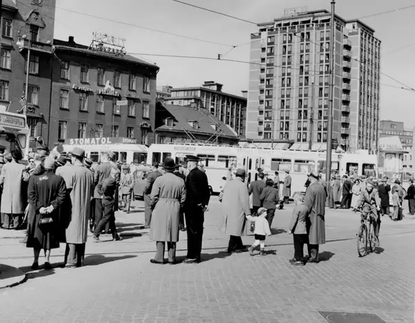 Oslo Sporveier. Trikk motorvogn 235 type Høka MBO (åpningstrikken) og vogn 236 (VIP-trikk) med tilhengere type Høka TBO på linje 4 klare for avgang fra torget på Lambertseterbanens offisielle åpningsdag, 28. april 1957. Folkeansamling. Hotell Viking.