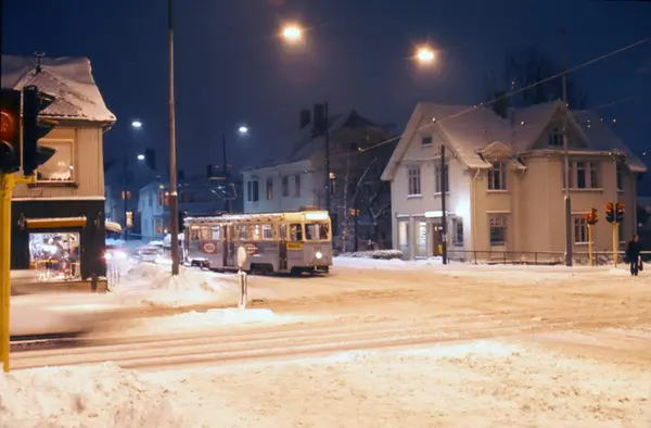 Oslo Sporveier. Trikk motorvogn 249 type Høka MBO svinger inn fra Grefsenveien mot Storoveien og Grefsen vognhall. Kvelds / vinterstemning ved Storokrysset.