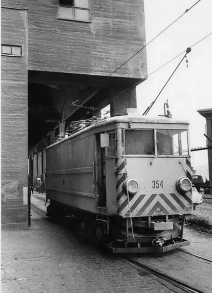 Oslo Sporveier. Trikk spesialbygget godsmotorvogn 354 type K, "korntrikken" på vei inn under den nyeste kornsiloen på Vippetangen. Vogna benytter den sidestilte kontaktledningen inn under siloene med egen trolleystrømavtager. Sporet inn under denne siloen var felles med jernbanen (veksel i forgrunnen), det eneste sporet i Norge som regulært ble brukt både av jernbanetog og sporvogn.