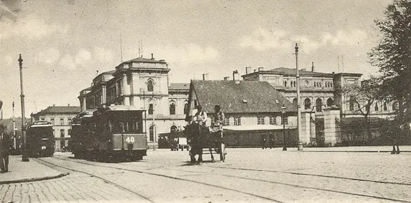 Blåtrikk tilhenger 40 (fra 1894) type Kühlstein og motorvogn 29 type U (Union), terminalen i Strandgata ved Paléhagen. Østbanebygningen mot Christian Frederiks plass i bakgrunnen. Hestetransport.